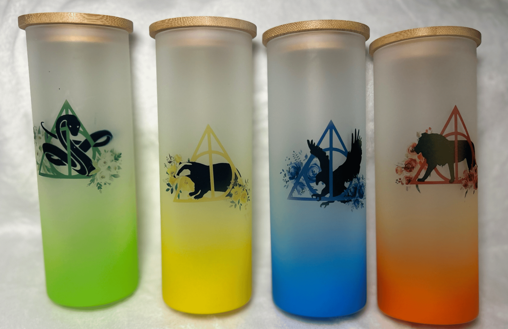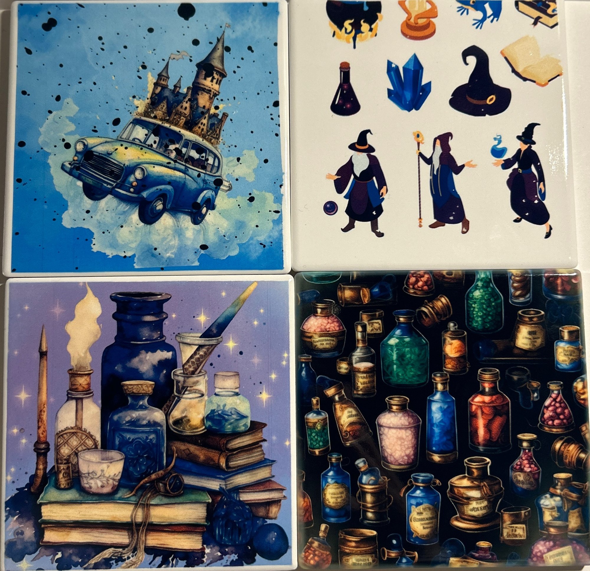 This awesome gift set comes with all four cups (1 for each house), four coasters, and two keychains.