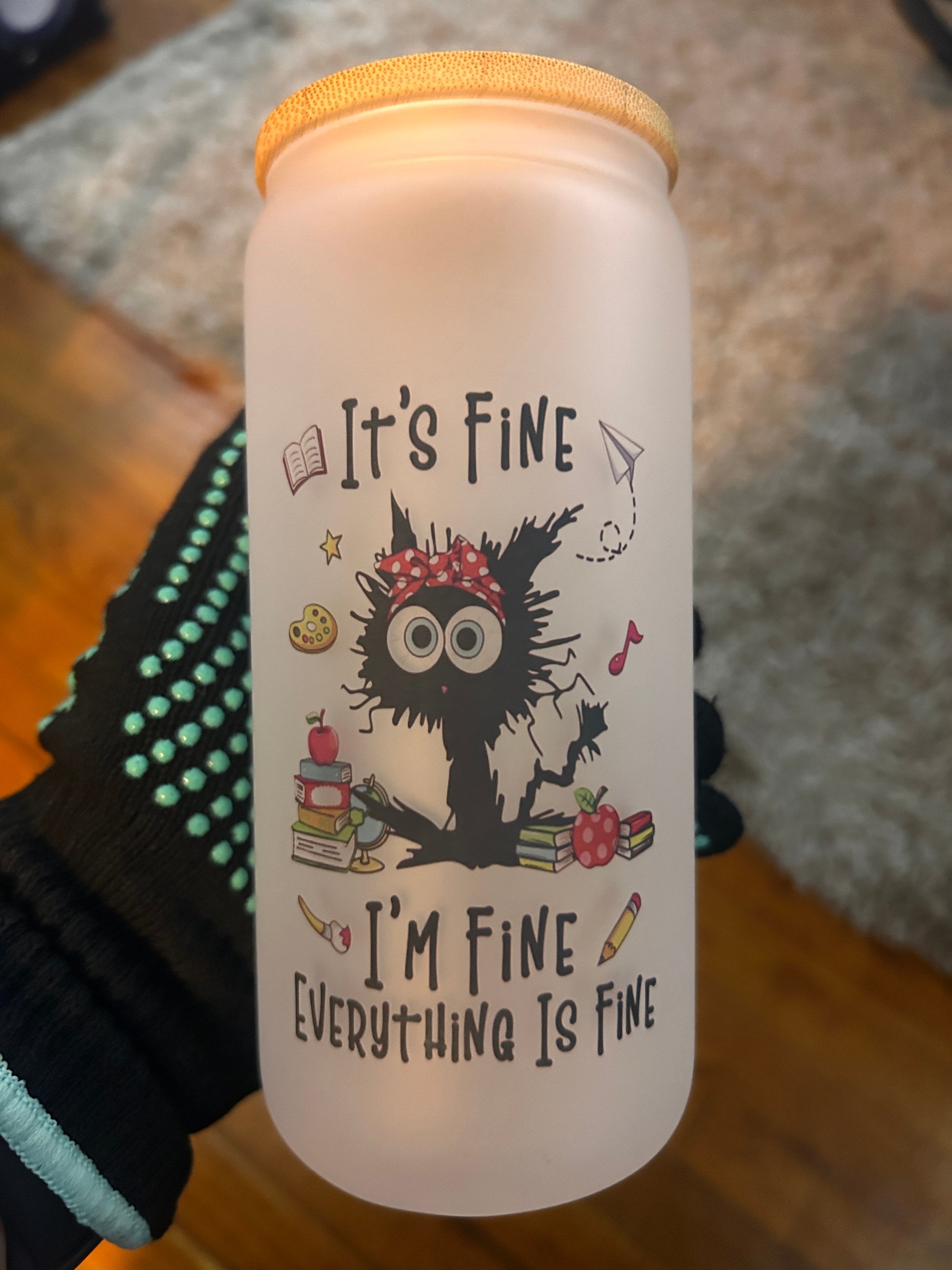 It's Fine Glass Cup- Everything is Fine- Cat Wrapped Up in Christmas Lights Glass Cup